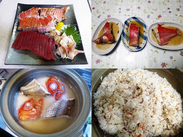 夕食はお店でさばいてもらった北寄貝のお刺身、カワハギのお刺身、ノドグロ